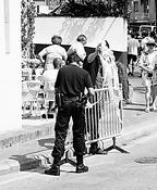 Gent mirant la platja de Lloret, desallotjada pels cossos de seguretat.