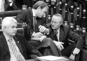 + El president de la Generalitat, Pasqual Maragall, i els senadors del PP Pío García Escudero i Josep Piqué, ahir, durant el debat de les autonomies al Senat. Foto: PACO CAMPOS / EFE.