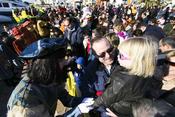 + El patge, saludant ahir a una de les nenes de Cambrils que el va anar a rebre. Foto: D. BALAGUER