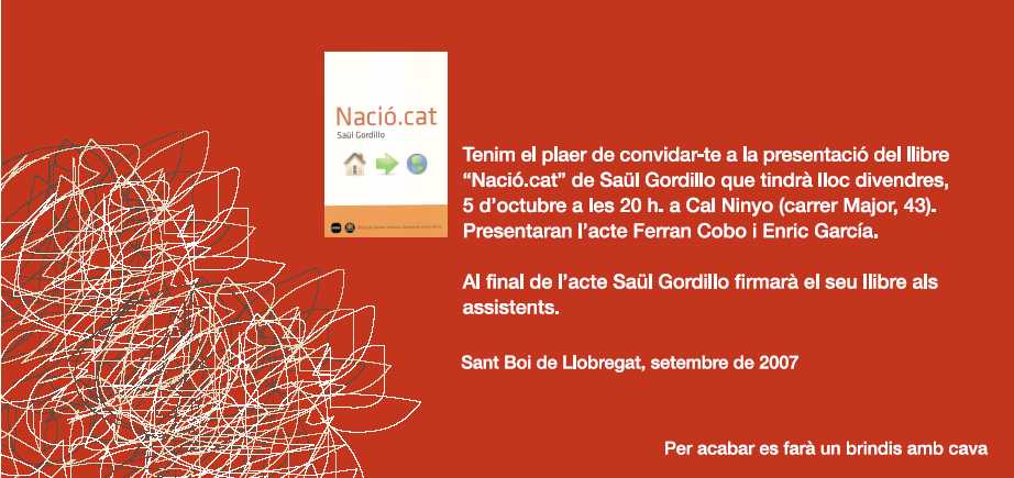 Xarxa Santboiana organitza la presentació del llibre "Nació.cat" que es farà el proper divendres, 5 d'octubre, a les 20h a Cal Ninyo (Carrer Major, 43) de la nostra ciutat. Aquest acte comptarà amb l'assistència de l'autor del llibre, el reputat blocaire Saül Gordillo i director de l'Agència Catalana de Notícies, i compta amb el suport de L'Oreig, Grup d'Acció Cultural, l'Associació de Llibreters de Sant Boi, el Cibercafè de Cal Ninyo, Vilaweb Sant Boi, Comik, el Consell Municipal del Barri Centre i el Patronat Municipal de Cultura. Al final de l'acte es farà un convit amb cava. Per això, cal confirmar l'assistència, i el nombre aproximat de persones que hi vindran per correu electrònic, o bé per telèfon al número 936526053.
