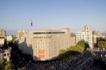 Cultura ACN 03.07.2023 Un funàmbul travessa el passeig de Gràcia a 70 metres d'altura L'equilibrista ha recorregut la distància entre la Gran Via i el Portal de l'Àngel caminant sobre una cinta per inaugurar el Grec Ciutat