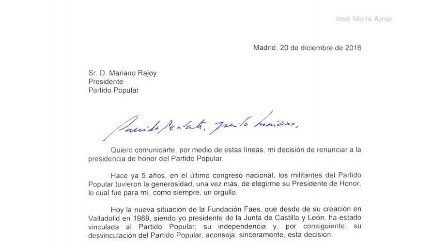 La presidenta del PPCV, Isabel Bonig, ha expressat el seu "respecte" a la decisió de l'ex cap de l'Executiu i president de FAES, José María Aznar, de renunciar a la presidència d'honor del PP, i ha subratllat que ha sigut "una figura molt important en el PP i en la història d'Espanya".