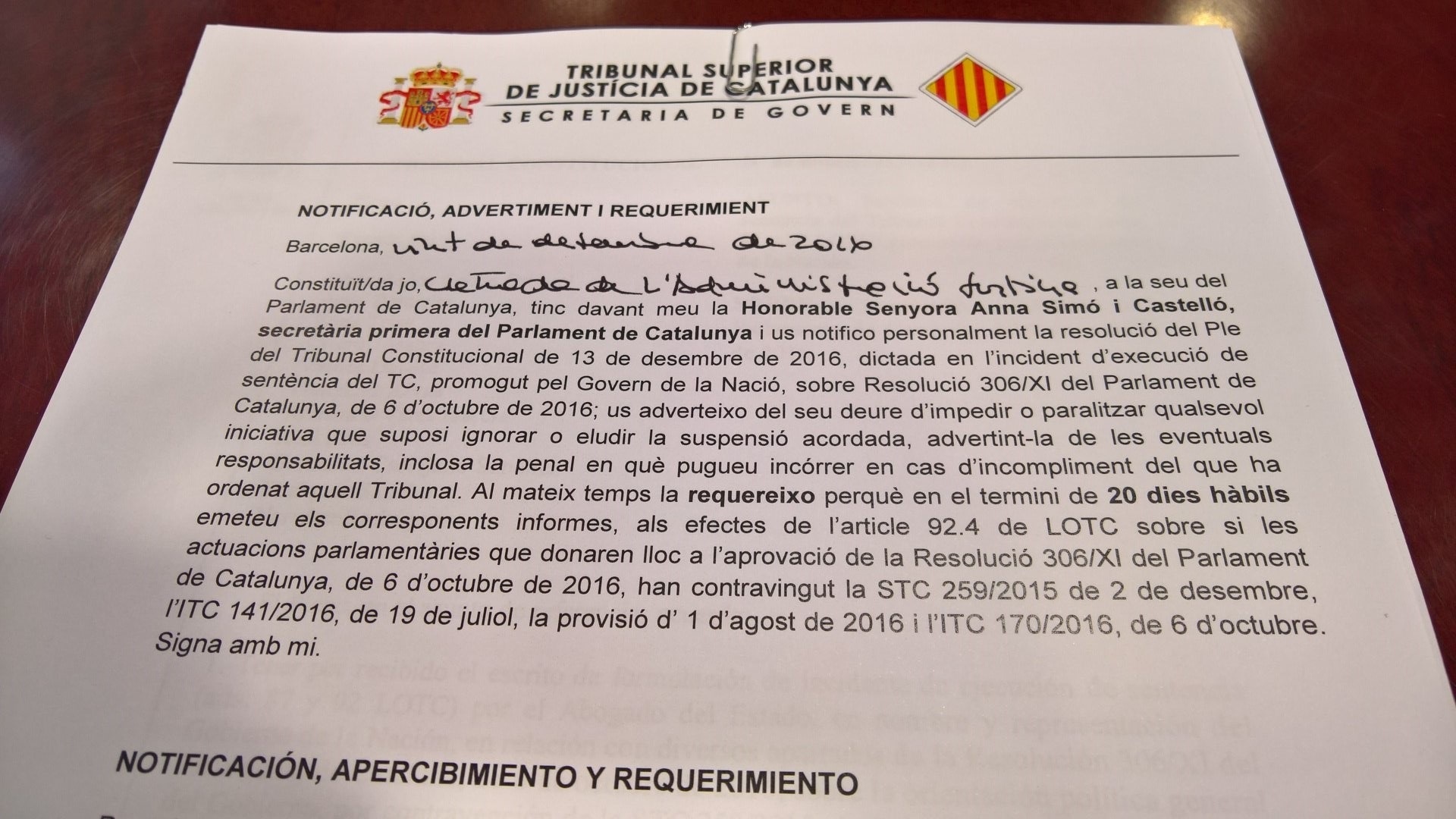 Els recorda que incomplir la sentència del TC pot comportar la via penal
