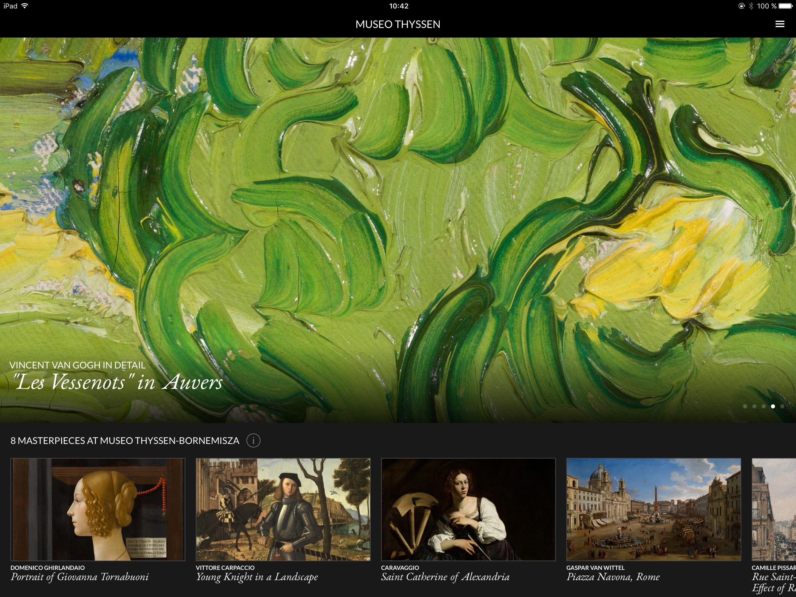 El Museu Thyssen-Bornemisza i l'empresa Madpixel han presentat aquest dijous el projecte 'Second Canvas Thyssen' en què posen a disposició del públic vuit obres de Caravaggio, Zurbarán, Van Gogh o Pissarro en "súper alta resolució" per fer accessibles detalls dels quadres que, a simple vista, no serien observables, segons han explicat els responsables de programa.