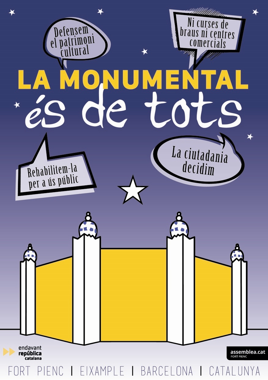 L'ANC del barri barceloní de Fort Pienc ha impulsat la campanya 'La Monumental és de tots' per reclamar que la plaça de toros Monumental de converteixi en "un equipament públic de país, de ciutat i de barri", en una acció que es farà arribar a les bústies d'uns 20.000 habitatges del barri, als comerços i als principals equipaments.