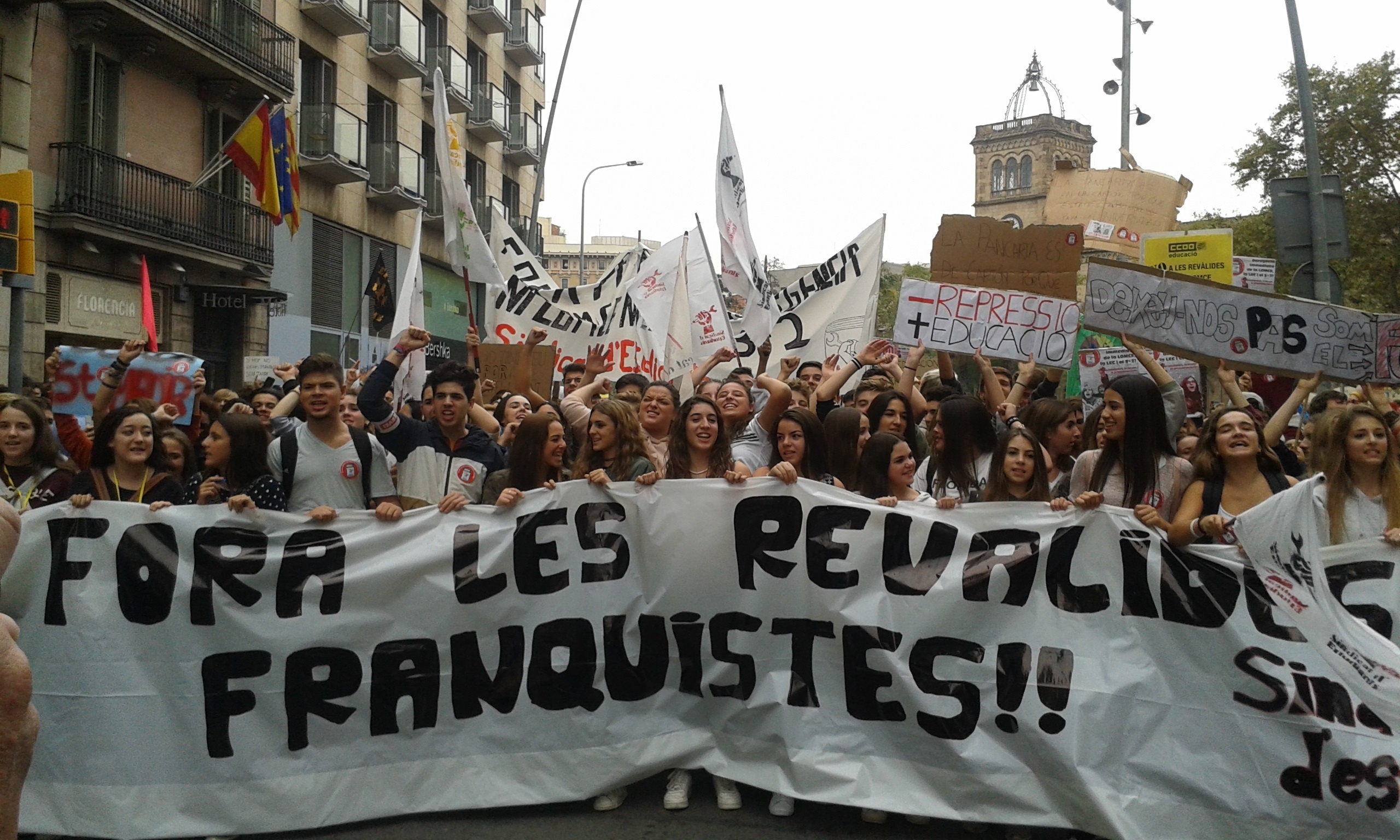 Més de 3.000 persones es manifesten aquest dimecres pel centre de Barcelona convocades pel Sindicat d'Estudiants (SE) contra les proves finals d'avaluació d'ESO i Batxillerat que preveuen la Llei Orgànica de Millora de la Qualitat Educativa (Lomce).