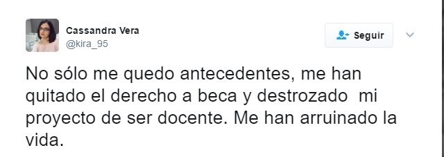 La tuitera Cassandra, condemnada a un any de presó per l'Audiència Nacional per publicar a Twitter acudits sobre Luis Carrero Blanco, ha utilitzat la mateixa xarxa social per lamentar les conseqüències d'aquesta pena.