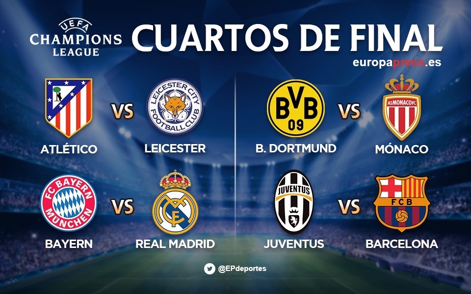 El Reial Madrid es mesurarà amb el Bayern de Munic en els quarts de final de la Lliga de Campions, mentre que l'Atlètic ho farà contra el Leicester City i el FC Barcelona davant la Juventus, tal com ha ofert el sorteig celebrat aquest divendres a la seu de la UEFA a Nyon (Suïssa).