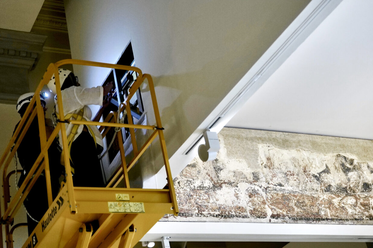 Els quatre tècnics aragonesos analitzen les pintures exposades al MNAC per estudiar-ne el trasllat. Fotografia: Fabian Simon.