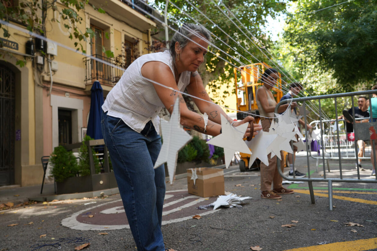 Unes quantes persones treballen en els guarniments del carrer de Valladolid, al barri de Sants de Barcelona. Fotografia: Eli Don.