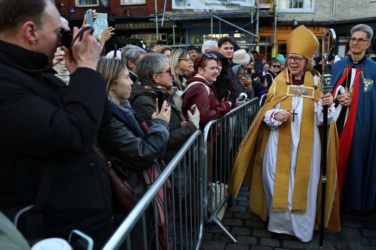 Sarah Mullally, amb simpatitzants, després de la seva investidura com a arquebisbessa de Canterbury, bisbessa principal de l’Església d’Anglaterra. Fotografia: Neil Hall.