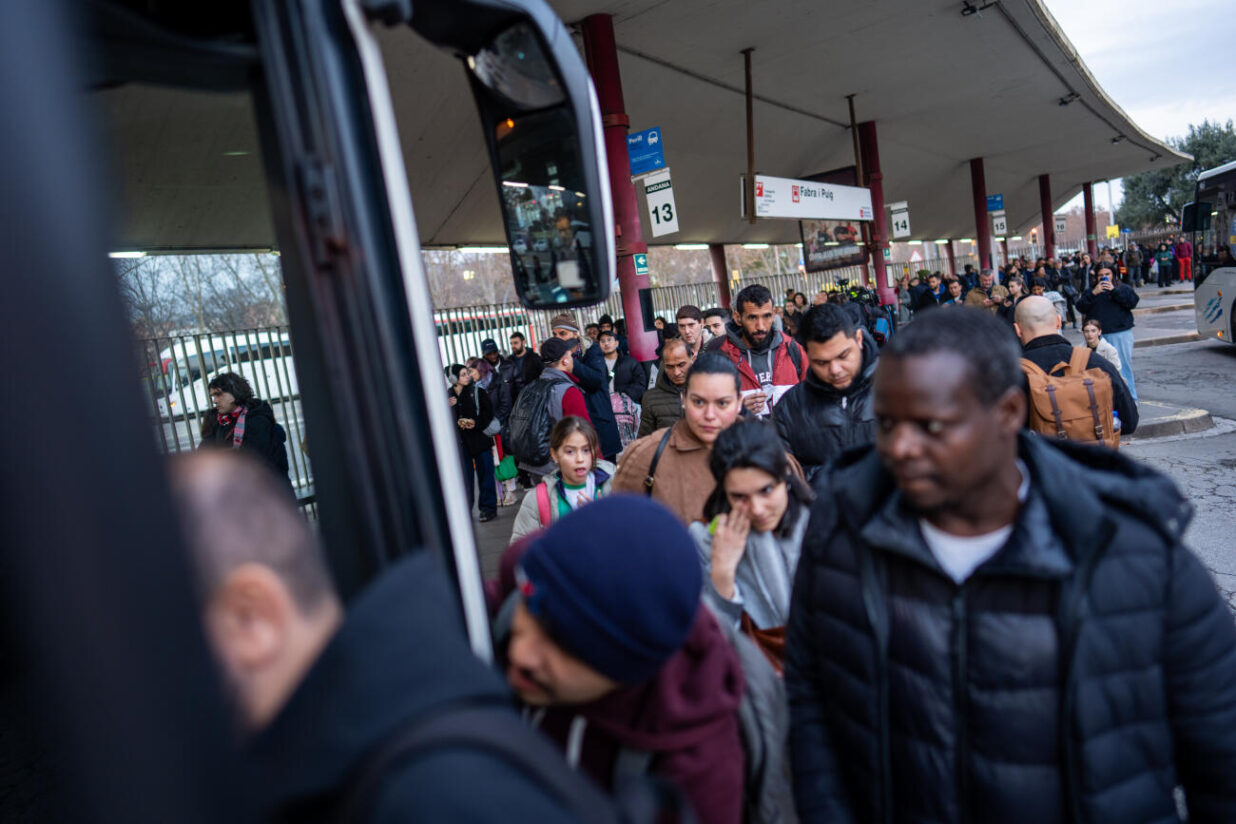 Usuaris a l’estació de Fabra i Puig per a entrar en un autobús, arran de la manca de trens. Fotografia: ACN.