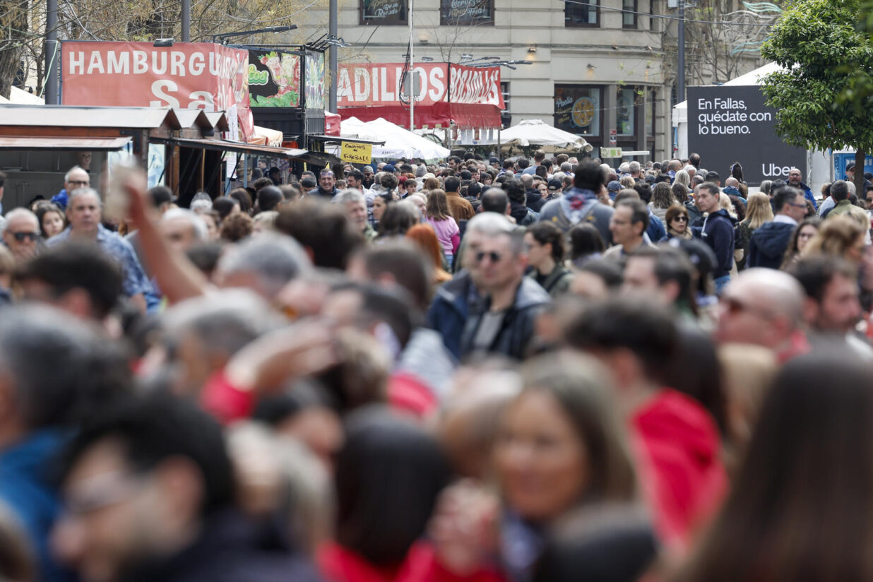 A València no hi cap una agulla aquest cap de setmana, el primer dels dies grossos de Falles. Una aglomeració que ha accentuat el debat creixent sobre la necessitat de fer decréixer la festa. Fotografia: EFE/Kai Försterling.