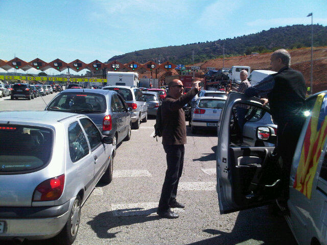 Una caravana important de cotxes ha arribat al peatge pocs minuts després de migdia, amb senyeres i banderes estelades, i ha col·lapsat totes les cabines de peatge.