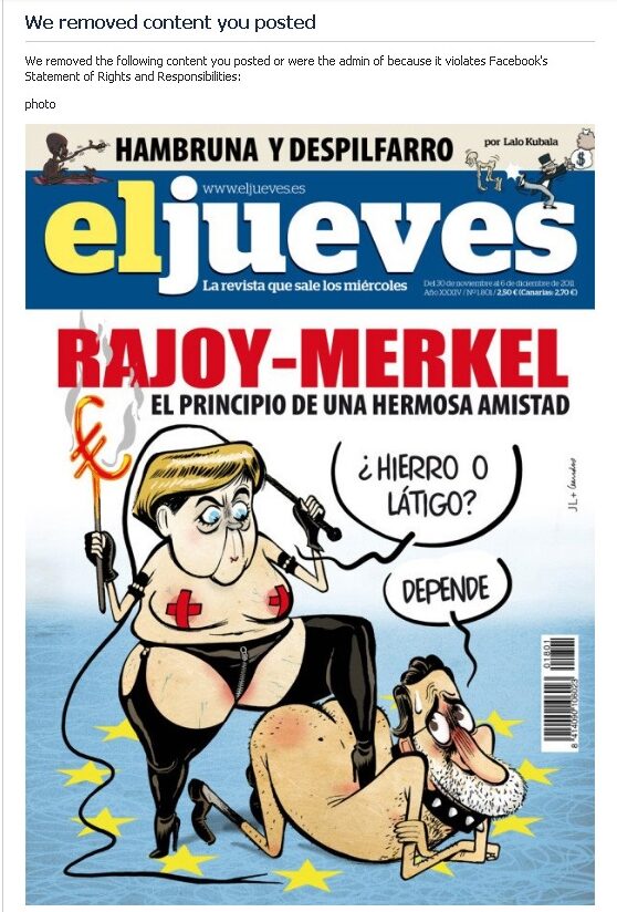 Facebook és protagonista novament per un cas de censura de continguts. En aquesta ocasió, ha vetat la publicació en la pàgina que té en aquesta xarxa social la revista El Jueves de la imatge d’una portada en què apareixen Mariano Rajoy i Angela Merkel en una escena sadomasoquista. És curiós, tal com diuen els responsables de la revista, que la portada no fou pas vetada el novembre de l’any passat, quan es va publicar per primera volta la portada. ‘Ahir Facebook va retirar la imatge i va comunicar a l’administrador que l’havia publicada que el sancionava amb trenta dies sense poder publicar contingut al Facebook’.