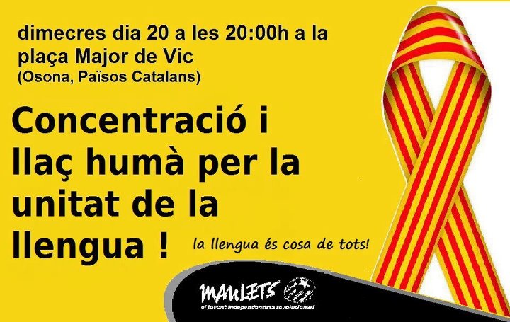 És per això que convoquem a tothom, especialment entitats i organitzacions culturals i en defensa de la llengua, a concentrar-nos davant l’ajuntament de Vic DIMECRES 20 DE JUNY a les 8 DEL VESPRE per mostrar el nostre rebuig i fer un llaç humà al mig de la plaça major.