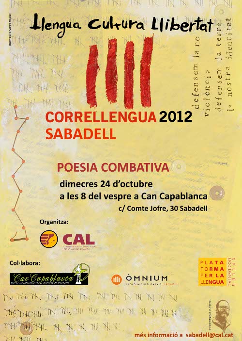 A les vuit del vespre d’avui dimecres es celebrarà al Casal Independentista i Popular de Sabadell ‘Can Capablanca’ l’arribada de la flama del Correllengua 2012, que va iniciar el seu recorregut a Ripoll el passat 30 de juny i que finalitzarà el 10 de novembre, de manera conjunta, a Figueres i Perpinyà.
