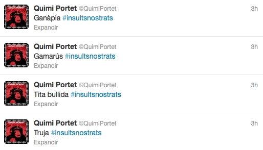Juanico ha proposat ‘Calamar d’aigo dolça!’ i ‘Cap de fava!’, mentre que Mas ha suggerit ‘Toix’. També s’hi ha sumat el periodista Emili Manzano amb l’insult ‘Bosses tristes’. Després de repiular desenes d’insults que han fet usuaris ben diversos, Portet ha tancat la iniciativa amb el piulet següent: