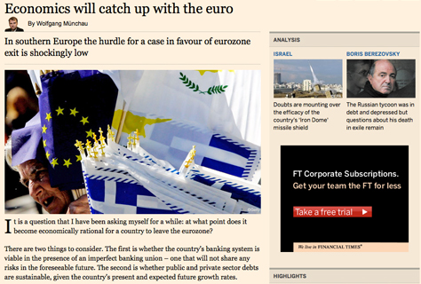 El govern espanyol s’ha cansat de repetir per activa i per passiva que la crisi de Xipre no arribaria en cap cas a l’estat espanyol. Avui, però, el prestigiós diari econòmic Financial Times publica un article, del periodista Wolfang Münchau i titulat ‘L’economina es posarà a dia amb l’euro’, en què diu el contrari i arribar a suggerir que Espanya surti de la zona euro. ‘És irracional per a qualsevol estalviador espanyol mantenir els seus diners, per petita que sigui la quantitat, en bancs espanyols’, diu l’article i matisa que, amb l’excepció del BBVA i el Santander, el sistema bancari espanyol està en fallida.