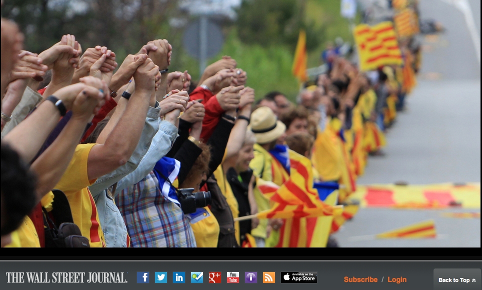 The readers of the Wall Street Journal have deemed as one of the best photograph of the year a picture of the ‘Catalan Way towards independence’, a 400-kilometre-long human chain which crossed the whole of Catalonia, from north to south, on the 11th of September 2013. 1.6 million Catalans took part in the largest-ever demonstration in Catalonia, asking for independence from Spain. Many Catalan figures from the political, cultural and socio-economic sphere also participated in the event.
