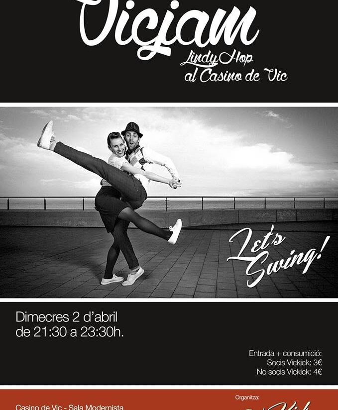 Aquest dimecres, 2 d’abril, es fa la segona sessió de ball de Lindy Hop al Casino de Vic, organitzada per l’associació Vic Kick. Després de l’èxit de la primera jam, que es va fer el dia 19 de març, Vic Kick organitzarà ballades aquesta primavera al Casino cada primer i tercer dimecres de mes.