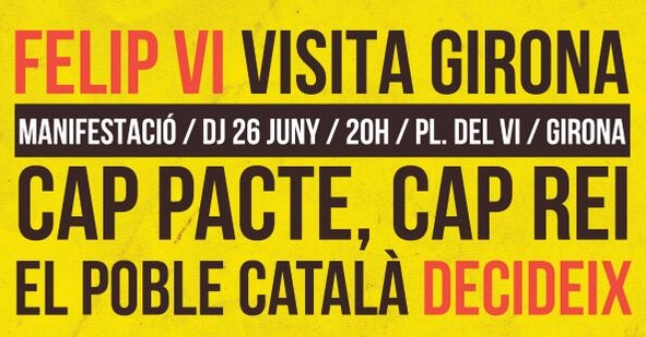 Els qui convoquen la protesta asseguren que, a més del rebuig a la monarquia, ara més que mai cal fer bandera del dret de decidir: ‘El rei Felipe VI ve amb intencions de rentar la cara a la institució, i tot plegat forma part d’una estratègia per a dir-nos novament que la unitat d’Espanya és indissoluble; però nosaltres ja hem emprès el nostre itinerari democràtic, que és el dret de decidir, i la via que hem escollit és la consulta del 9-N’, va dir Terés.
