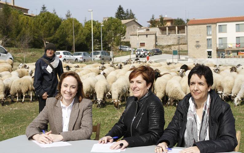 Van signar el document a l’exterior de l’ajuntament, amb la presència de diversos representants de la Fundació del Món Rural, el grup de treball de la Transhumància, i els tècnics de l’Institut per al Desenvolupament i la Promoció de l’Alt Pirineu i Aran, i el Parc del Foix. Tots ells, conjuntament amb els ajuntaments, dissenyaran el projecte de difusió i potenciació dels camins ramaders i la transhumància. Durant l’acte, Ramon Rocadembosch va menar el seu ramat rere les alcaldesses. Tal com va dir, fa 35 anys que les treu diàriament, sense fallar ni un dia. El dia de l’acord no podia ser menys.