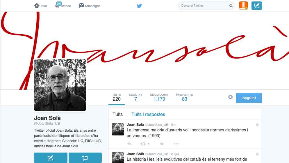 Per Sant Jordi es va obrir el compte de Twitter @JoanSola_UB. Fins el 27 d’octubre, dia en que farà cinc anys de la mort del filòleg de Bell-lloc d’Urgell, es podran llegir cada dia una piulada on recollirà un fragment d’escrits de Joan Solà.