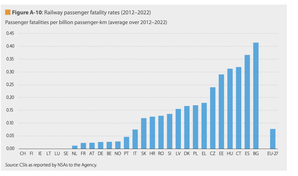 L’estat espanyol té un dels pitjors índexs de mortalitat a Europa en els seus trens. Dels 28 països que la Unió Europea ha analitzat durant més d’una dècada, només Bèlgica té unes xifres pitjors. I amb l’accident d’aquesta setmana a Còrdova i posteriorment a Gelida, és possible que a final d’aquest 2026 l’estat espanyol sigui el país amb l’índex de mortalitat més alta. Unes dades que són molt dolentes no per la quantitat d’accidents mortals que hi ha, sinó perquè els pocs accidents que hi ha hagut a l’estat tenen xifres molt altes. Heus ací la gràfica de l’índex de letalitat per quilòmetre i passatger a la Unió Europea, del 2010 al 2024, de l’Agència Europea del Ferrocarril, creada pel Parlament i el Consell d’Europa. L’estat espanyol, a la dreta de tot, només és superat per Bèlgica.