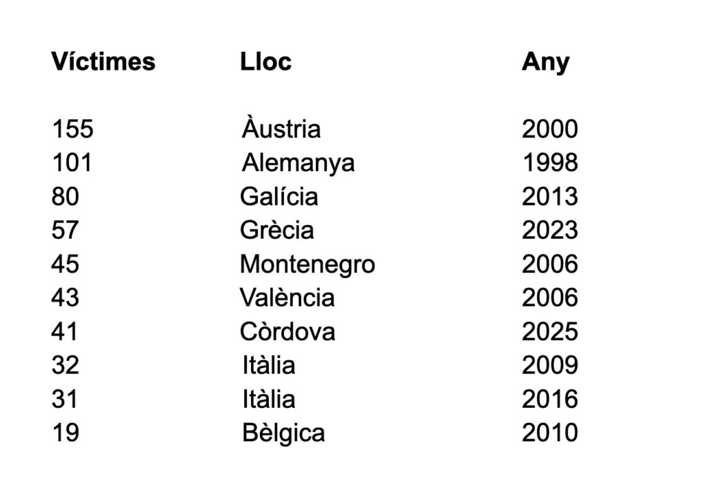 L’informe de l’agència europea (pdf) avisa que, tot i que els índexs es fan cada tres anys i cada deu, “els accidents greus amb un gran nombre de víctimes de passatgers encara pesen molt en les estimacions”. I detalla: “Un cas extrem és el descarrilament a Sant Jaume de Galícia, que va tenir lloc el 2013 i ha fet que la taxa de mortalitat de passatgers a Espanya sigui una de les més altes d’Europa.” Aquesta setmana ha tornat a passar. Un sol accident ha causat un gran nombre de morts; de moment, quaranta-un. En unes altres dades del mateix informe, com ara els morts de l’any 2024, o els morts per quilòmetre de via (sense introduir-hi els passatgers), l’estat espanyol hi apareix amb molt poques víctimes.