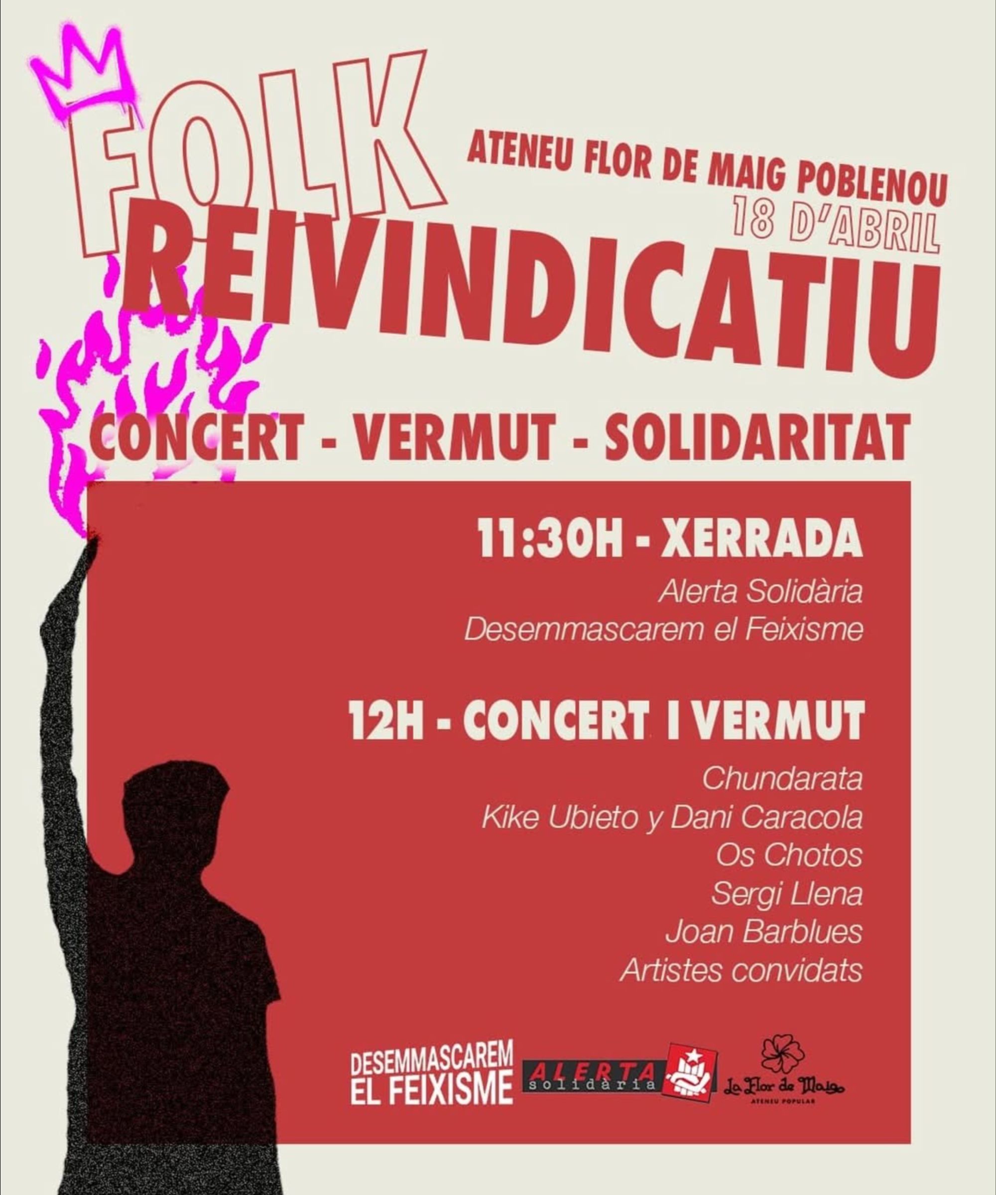 Per tal de mostrar la solidaritat col·lectiva amb els encausats, el seu grup de suport i Alerta Solidària han organitzat avui una xerrada, un concert i un vermut a l’Ateneu Flor de Maig del Poblenou (Doctor Trueta, 195). A les 11.30 les dues entitats faran una xerrada i a les 12.00 començarà el concert-vermut amb Chundarata, Kike Ubieto i Dani Caracola, Os Chotos, Sergi Llena, Joan Barblues, entre més artistes convidats.
