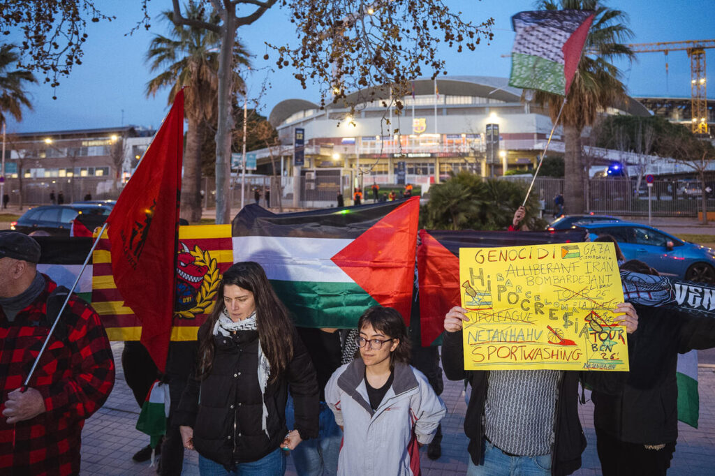 Un centenar d’activistes pro-palestins han tallat el trànsit al carrer d’Arístides Mallol de Barcelona, davant el Palau Blaugrana, com a protesta pel partit d’Eurolliga que es disputa a porta tancada entre el Barça i el Hapoel Tel-Aviv al complex esportiu barceloní. El centenar d’activistes s’han anat concentrant en aquest punt a partir de les set de la tarda, i cap a tres quarts de vuit han decidit de tallar el carrer per fer sentir la protesta i s’han assegut a terra. Els impulsors de la protesta han criticat la connivència política i esportiva amb un estat “genocida” i han reclamat un embargament real d’armes a Israel. El partit comença a dos quarts de nou del vespre.