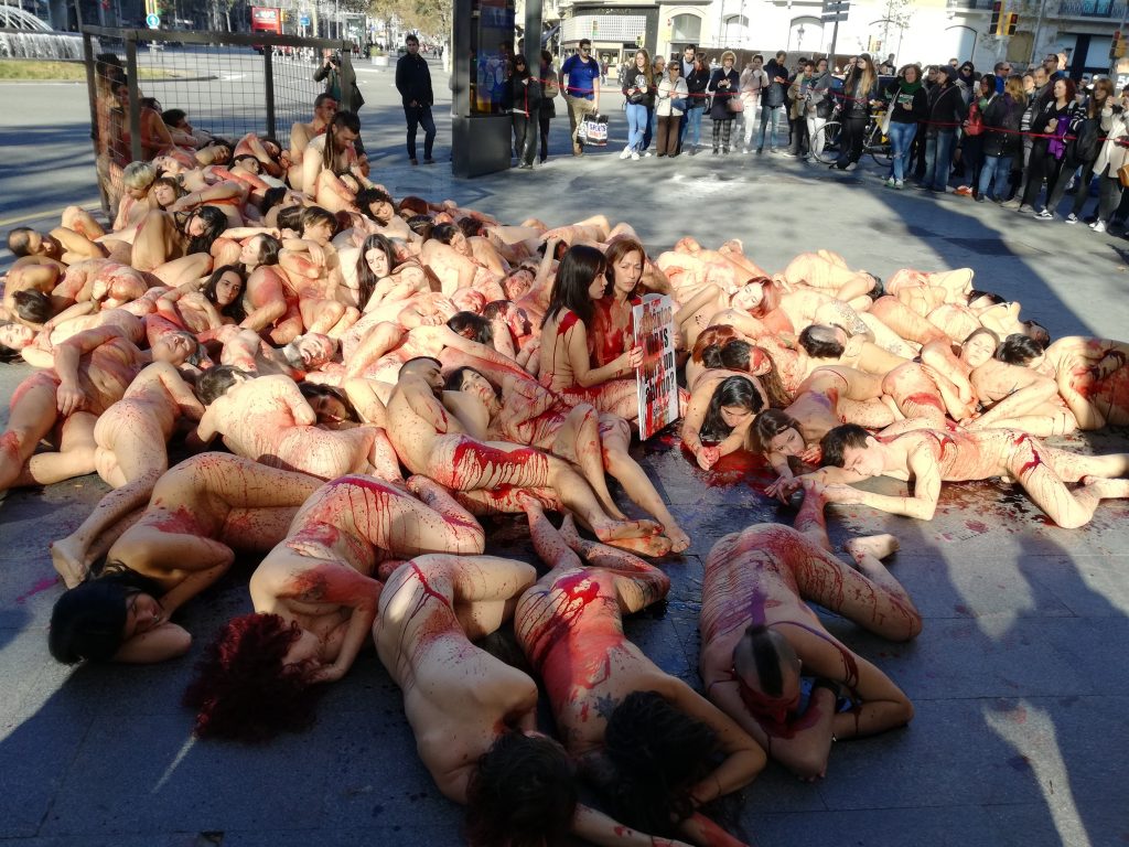 ‘No et posis la seva pell, posa’t en la seva pell’, ‘Quantes vides per un abric?’ o ‘Ells necessiten la seva pell, el teu no’ han estat alguns dels missatges que els activistes han llançat a la població despullats, coberts de sang artificial i amuntegats els uns amb els altres per representar la situació que viuen els animals víctimes de la indústria pelletera.