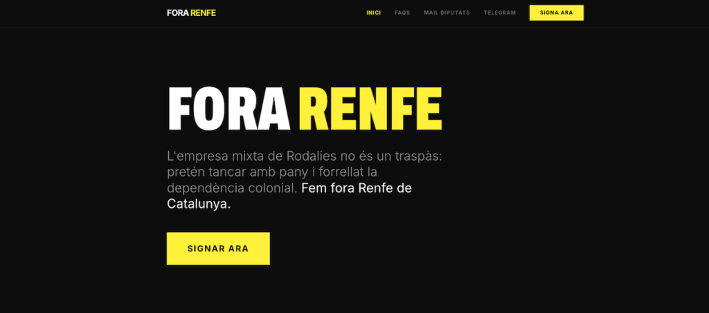 La formació independentista Alhora ha impulsat la plataforma digital Forarenfe.cat amb l’objectiu de frenar la creació de l’empresa mixta Rodalies de Catalunya SME. En poques hores, més de 3.000 persones s’hi han inscrit i ja s’han enviat més de quinze mil correus electrònics als diputats de la Comissió de Territori del Parlament, responsable de la política de transport i mobilitat.