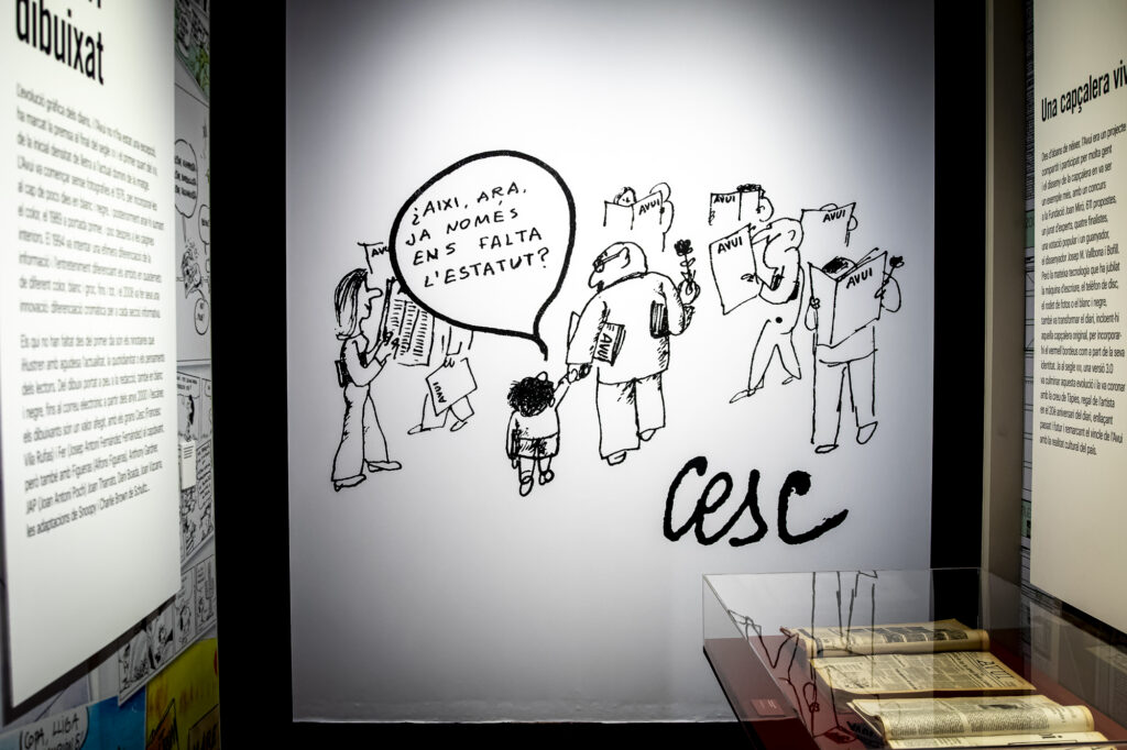 Per als periodistes més joves, l’exposició també permet l’exercici immersiu de descobrir com era la professió analògica: cendrers plens de burilles, pipes, agendes de paper –peça clau en la professió periodística–, telèfons de sobretaula i, sobretot, màquines d’escriure que eren l’hàbitat dels vint-i-quatre homes i dones pioners d’aquella redacció. La feina d’uns periodistes que es complementava amb els articles, cròniques, crítiques i opinions d’un ventall amplíssim d’escriptors, de Josep Maria Espinàs a Teresa Pàmies, de Montserrat Roig –que va enviar el seu darrer article el dia abans de morir-se– a Josep Maria Ballarín, i de Quim Monzó a Nèstor Luján. Però el diari Avui no es nodrí tan sols de les millors plomes de la literatura catalana, sinó que va fornir un fons d’art, amb sis-cents originals d’artistes que amb la seva obra van voler donar suport al projecte, de Salvador Dalí a Joan Miró, passant per Antoni Tàpies.