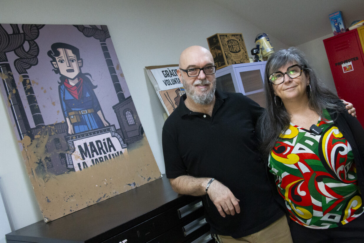 Duran i Giner comparteixen l’ofici i la vida, i són una parella d’èxits reconeguts internacionalment en el seu àmbit. Els visitem el dimarts dia 21. Fa vent i una basca que fins fa poc era impròpia a final d’octubre. L’espai és ample i lluminós. Ara, més acolorit que abans de l’avinguda del fang i l’aigua. Als banys han incorporat uns taulellets de color que ella ha dissenyat i que li ha fabricat Michael Barros, el jove ceramista de Sedaví que va idear unes rajoles amb el lema tan valencià de “fins ací va arribar la riuà” que es veuen ací i allà per tota l’Horta Sud. “Necessitàvem color”, diu Cristina, que ens ensenya com l’aigua va convertir el tros de l’estudi, que està per davall del nivell del sòl, en una piscina de fang, i com encara va pujar uns quants escalons per amunt. Prou per a fer malbé bona cosa de material. “L’endemà, quan hi vam entrar, va ser un xoc. La part de baix era una piscina, tot destrossat, i és clar, és un lloc que hem fet amb tot el nostre esforç, un espai pel qual encara estem pagant el primer préstec. Tot el projecte de la teua vida, veure’l destrossat, va ser impressionant.” Com a mostra d’això, conserven un cartell del seu llibre Maria la Jabalina, amb els baixos enfangats.
