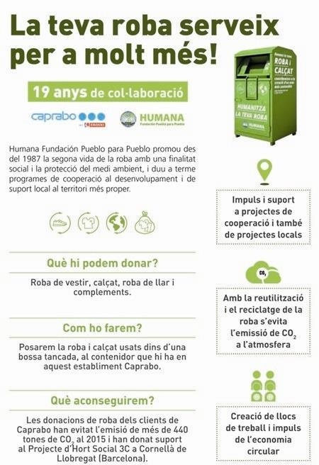 Segons ha informat la cadena de supermercats aquest dilluns en un comunicat, Caprabo col·laborarà en la campanya amb diferents accions informatives per fomentar la reutilització i el reciclatge de residus tèxtils; promocionar projectes socials com horts locals, i impulsar la reinserció sociolaboral de persones en perill d’exclusió social mitjançant la formació i la protecció del medi ambient.