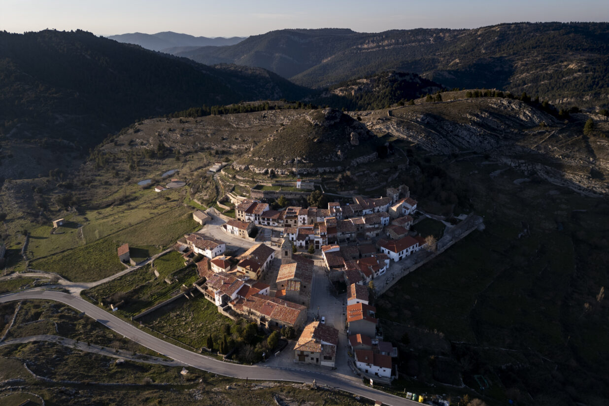Abans de caure la nit, mentre un parell de voltors sobrevolen les muntanyes, Isabel ens acompanya a la part alta del poble, lloc on se situava antigament l’església i el castell i on avui només en queden vestigis. De dalt de la muntanya estant s’observen totes les teulades i les xemeneies dels habitatges, que delaten amb el fum les llars on hi ha residents.