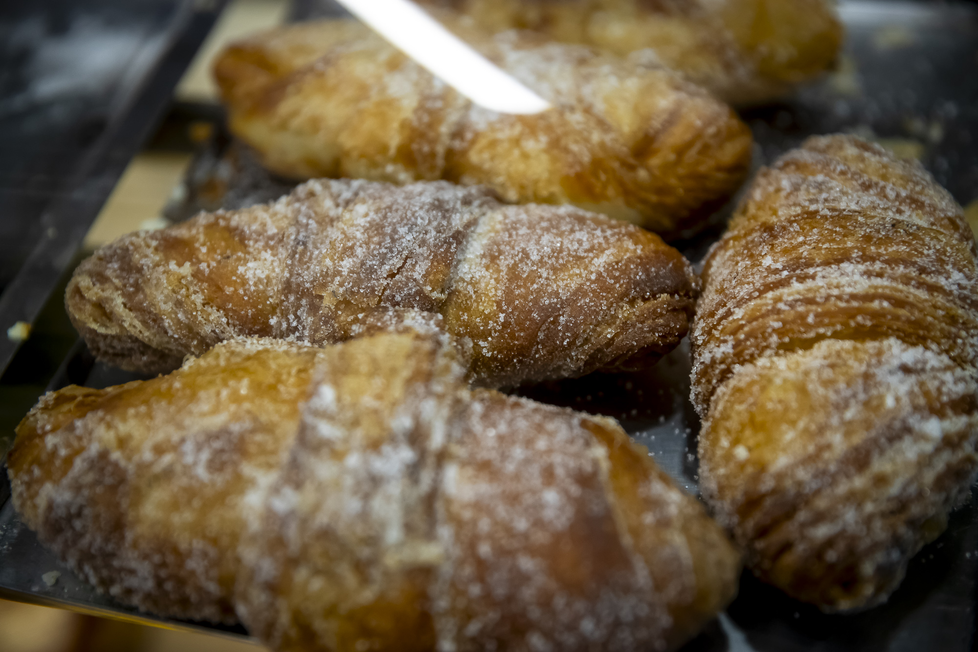 Pastes de festuc, llengües de gat, crocant, orangines, encenalls i tota mena de bombons mantenen l’obrador sempre actiu. Però el producte estrella d’aquesta pastisseria –diuen els propietaris– és el croissant de tota la vida, fet amb llard de porc i banyes. “Ve gent de tot arreu a buscar-ne. Entre setmana, en venem més de dos-cents el dia”, expliquen. “De mantega també en fem, però l’estrella és el de llard de porc. Ja el feia la família que havia tingut la botiga abans d’agafar-la el meu avi i el besoncle”, diu en Joan. “Innovem amb la tècnica, però no amb el producte. El producte el millorem, però és el producte clàssic. Tenim una laminadora antiga i una màquina pastadora que deu tenir seixanta o setanta anys i funciona com el primer dia. Però trobar mecànics que la reparin és més difícil ara.”