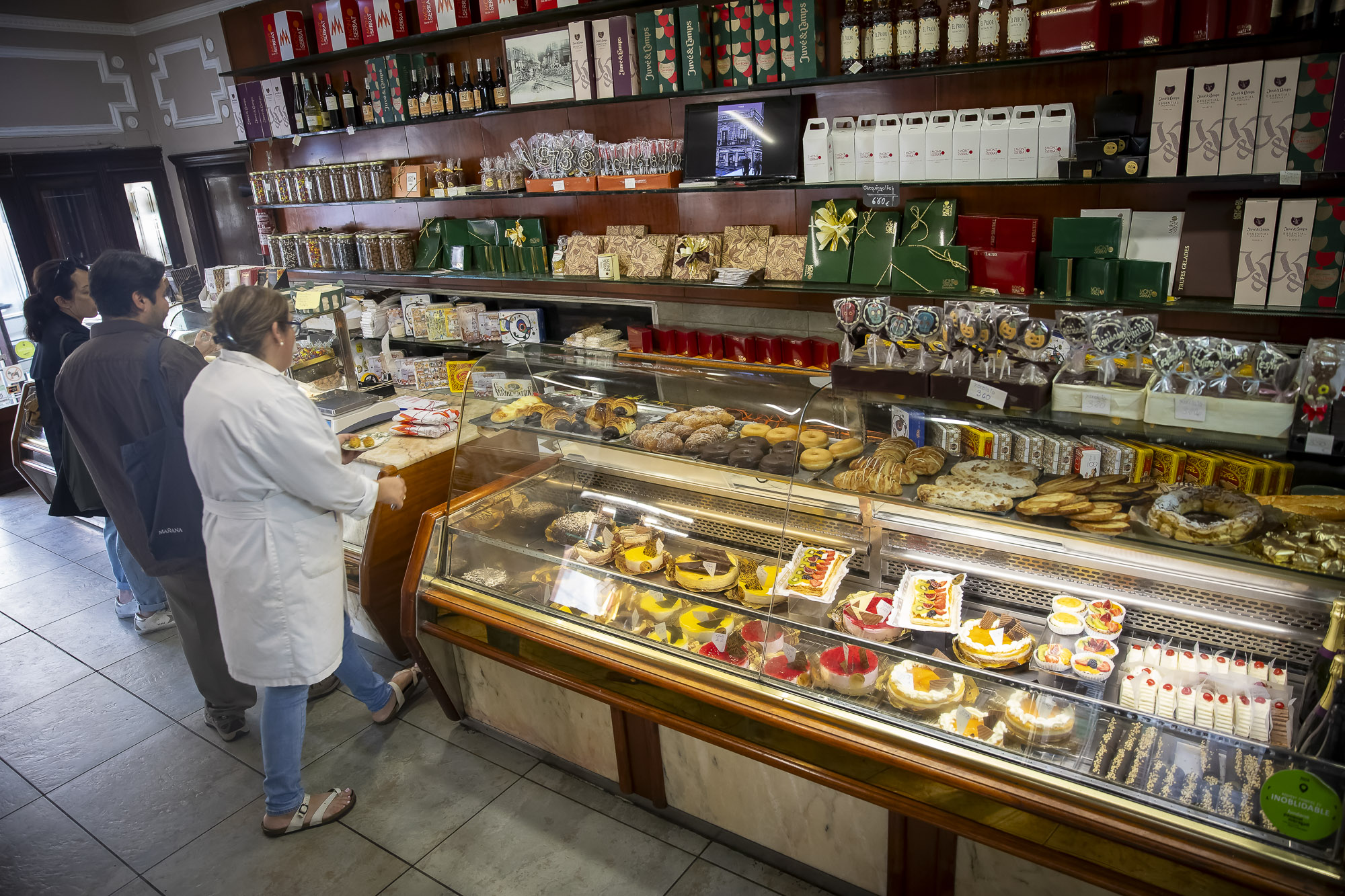 La ubicació de la pastisseria és molt bona. I les voreres tan estretes que l’envolten gairebé conviden a entrar-hi tothom. Dins, en una pantalla van passant imatges de pastissos d’aniversaris i celebracions per ajudar a triar el que més convingui. I, com a pastisseria de postres ben tradicionals, aquí cada sant té el seu tortell: “A part del de Reis, fem el de Sant Antoni, el de Sant Cristòfol, que és el patró dels taxistes, i per això li posem un volant, i al de Santa Llúcia, patrona de les modistes, unes tisores”, explica en Joan. També les coques marquen diferents celebracions de sants: Sant Joan, Sant Pere i Sant Jaume, i la crema per al dia del pare, Sant Josep.