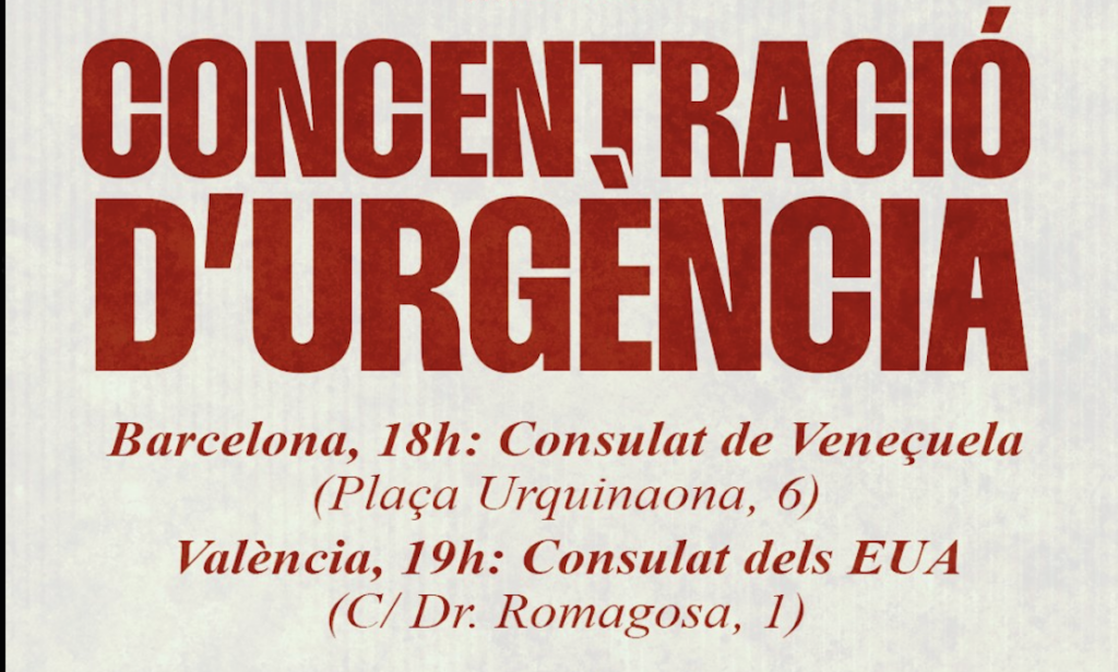 A Barcelona, la concentració és prevista a les 18.00 de la tarda a la plaça d’Urquinaona, davant del consolat de Veneçuela. A València, la convocatòria és a les 19.00 del vespre al carrer del Doctor Romagosa, davant del consolat dels Estats Units.