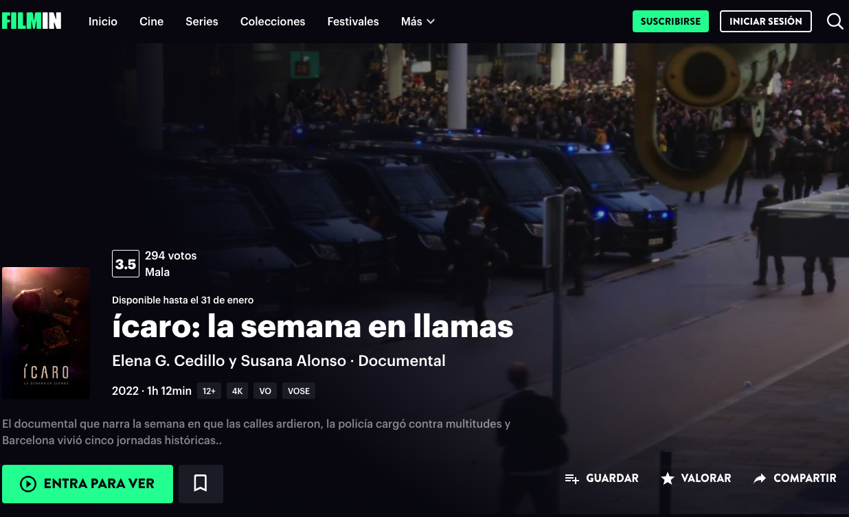 @Filmin @FilminCAT M'ha semblat increïble veure a la vostra plataforma el pamflet reaccionari "Ícaro: la semana en llamas". Un blanqueig a la repressió policial i les expressions més autoritàries q hem viscut a l'estat. Subscripció cancel·lada, després de 10 anys amb vosaltres.