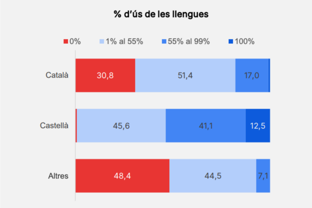 Les dades sobre l’ús del català no toquen fons. Segons l’Enquesta a la Joventut de Barcelona, menys d’un 20% dels joves entre quinze anys i trenta-quatre té el català com a llengua habitual, més d’un 30% no el parla mai i vora d’un 51% l’empra, però no com a llengua dominant. Les xifres dibuixen una situació preocupant per al futur de la llengua.