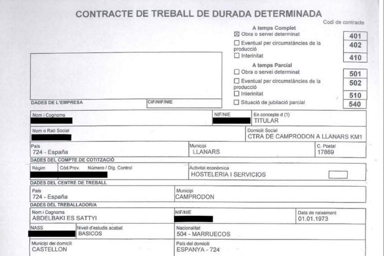 En el document, que ha pogut consultar VilaWeb, hi apareixen dades personals d’Es-Satti, com ara el nom complet, la data de naixement, el nivell d’estudis, el número de la targeta de residència i el municipi de residència. En aquest darrer punt es diu que era Castelló, tot i que estava empadronat a Onda (a més de 400 quilòmetres al sud de l’hípica). El contracte, amb data d’1 de febrer de 2015, era per hostaleria i serveis.