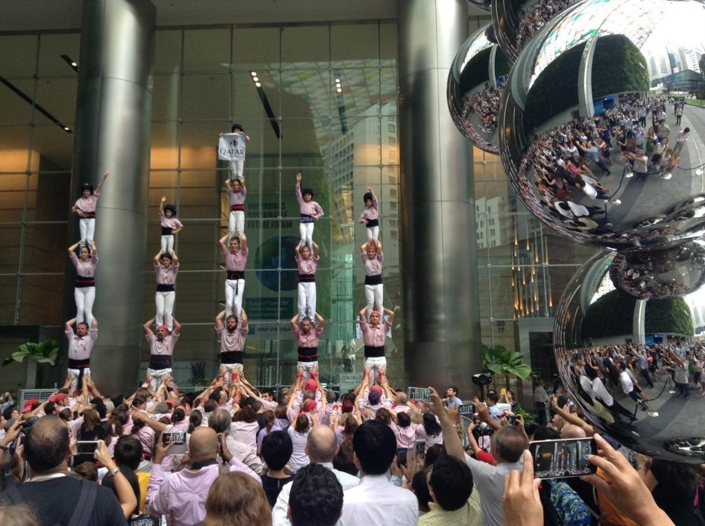 La colla castellera dels Minyons de Terrassa (Barcelona) ha ofert aquest dimecres a Singapur la primera de les cinc actuacions que preveu mostrar durant la setmana d’activitats ‘Catalonia-Barcelona is much habiti Week’, que organitza l’Agència Catalana de Turisme (ACT) de la Generalitat coincidint amb la IX fira turística ITB Asia.