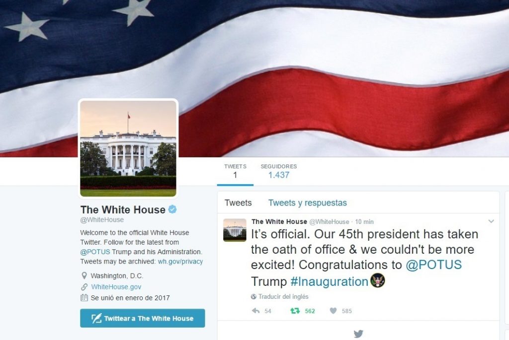 Després de jurar el càrrec davant del Capitoli, el compte @WhiteHouse ha canviat i presenta ara una foto del magnat novaiorquès, mentre que el compte usat fins minuts abans per Barack Obama ha estat traslladat al compte @ObamaWhiteHouse.