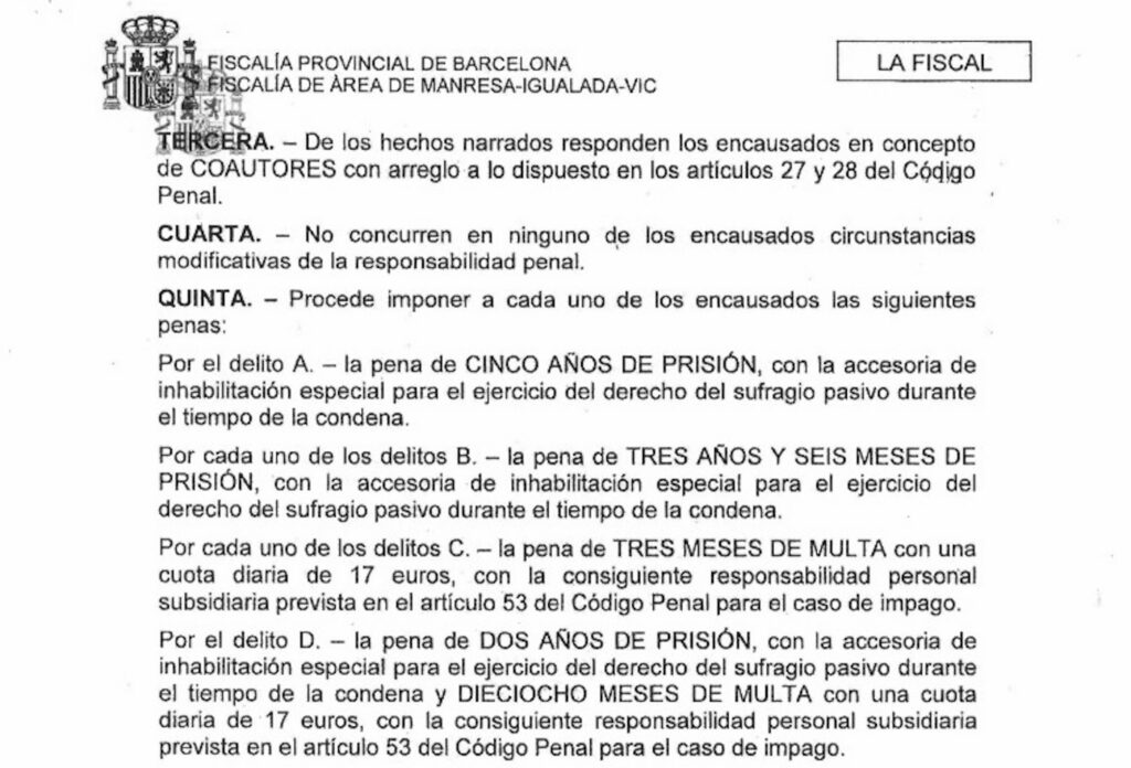 En l’escrit d’acusació, la fiscalia atribueix als cinc encausats delictes de desordres públics agreujats en concurs amb atemptat contra els agents de l’autoritat, lesions i danys a béns públics i privats. Les penes que sol·licita són molt dures, i inèdites en una causa com aquesta.