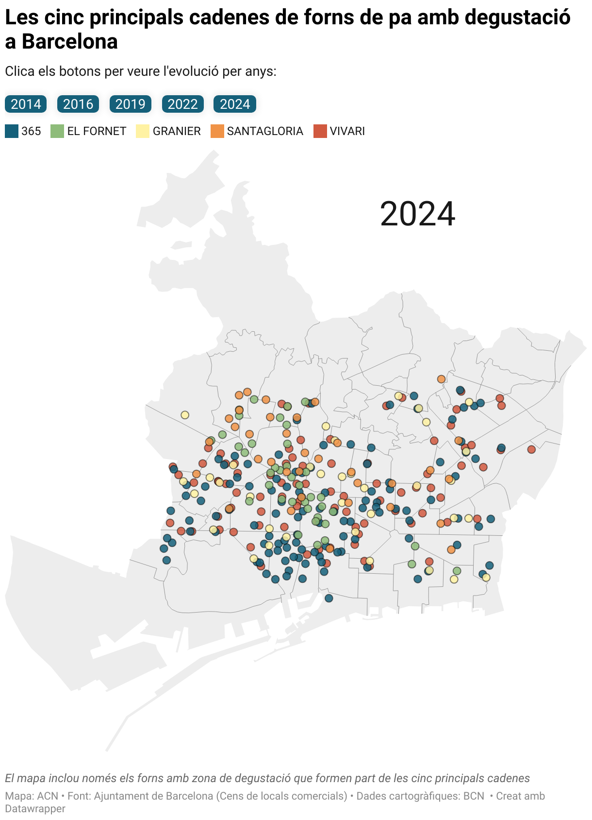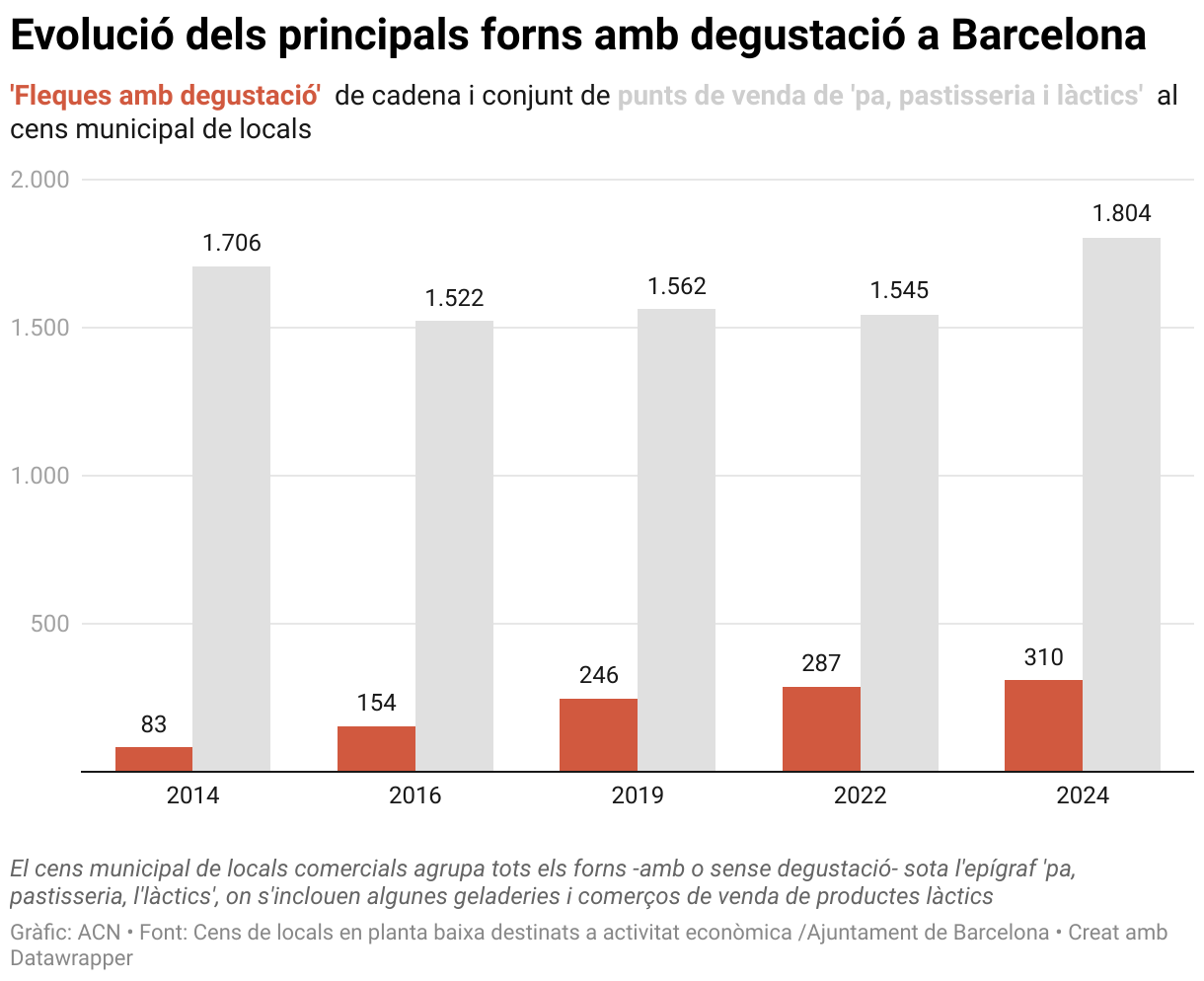 Els forns amb degustació són un negoci a l’alça a la ciutat de Barcelona. Els locals de les cadenes com Vivari, 365, Granier, Santagloria i el Fornet s’han multiplicat per quatre aquests darrers deu anys, i han passat de ser 83 a més de 300, segons el darrer cens municipal de locals comercials de l’any 2024. Actualment, aquestes cadenes gestionen 1 de cada 6 punts de venda de pa, pastisseria i làctics de la ciutat. Això representa un 17,1% del total, lluny del 3,7% que ocupaven fa deu anys.