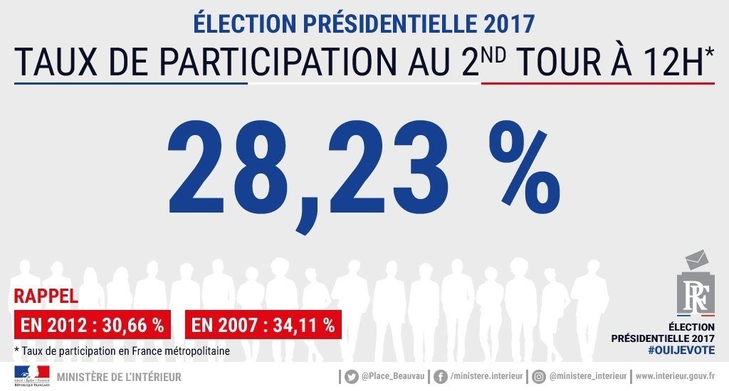 La participació a la segona volta de les eleccions presidencials franceses que se celebra aquest diumenge és del 28,23 per cent a les 12.00 hores, segons ha informat el Ministeri de l’Interior.