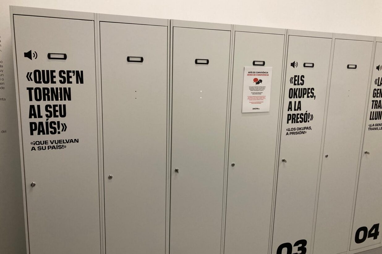 L’exposició PolsXtrems és una mostra interactiva i multimèdia que recrea un gimnàs simbòlic on els visitants poden “entrenar” la capacitat de dialogar sobre qüestions complexes i desenvolupar pensament crític davant la desinformació. El recorregut s’acaba en una sala que simula el vestidor del gimnàs, on uns quants armariets exposen conflictes socials amb dues perspectives diferents. I és en aquest espai on s’equipara aprendre català amb un conflicte social i amb continguts racistes i estigmatitzadors.